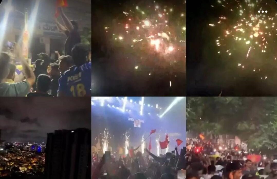 ਟੀਮ ਦੇ ਪਹਿਲੀ ਵਾਰ ਆਈਪੀਐਲ ਜਿੱਤਣ ਤੋਂ ਬਾਅਦ ਜਸ਼ਨ ਮਨਾਉਣ ਲਈ ਵੱਡੀ ਗਿਣਤੀ ਵਿੱਚ RCB ਪ੍ਰਸ਼ੰਸਕ ਰਾਤ ਨੂੰ ਬੇਂਗਲੁਰੂ ਵਿੱਚ ਸੜਕਾਂ ‘ਤੇ ਆ ਗਏ। ਪ੍ਰਸ਼ੰਸਕਾਂ ਨੂੰ ਆਰਸੀਬੀ ਦੇ ਝੰਡੇ ਲਹਿਰਾਉਂਦੇ ਅਤੇ ਨੱਚਦੇ ਹੋਏ ਦੇਖਿਆ ਗਿਆ, ਜਦੋਂ ਕਿ ਬੈਂਗਲੁਰੂ ਦਾ ਰਾਤ ਦਾ ਅਸਮਾਨ ਆਤਿਸ਼ਬਾਜ਼ੀ ਨਾਲ ਜਗਮਗਾ ਰਿਹਾ ਸੀ। ਪ੍ਰਸ਼ੰਸਕਾਂ ਨੇ ਜਸ਼ਨ ਦੀਆਂ ਤਸਵੀਰਾਂ ਅਤੇ ਵੀਡੀਓਜ਼ ਨੂੰ ਸੋਸ਼ਲ ਮੀਡੀਆ ‘ਤੇ ਸਾਂਝਾ ਕੀਤਾ।