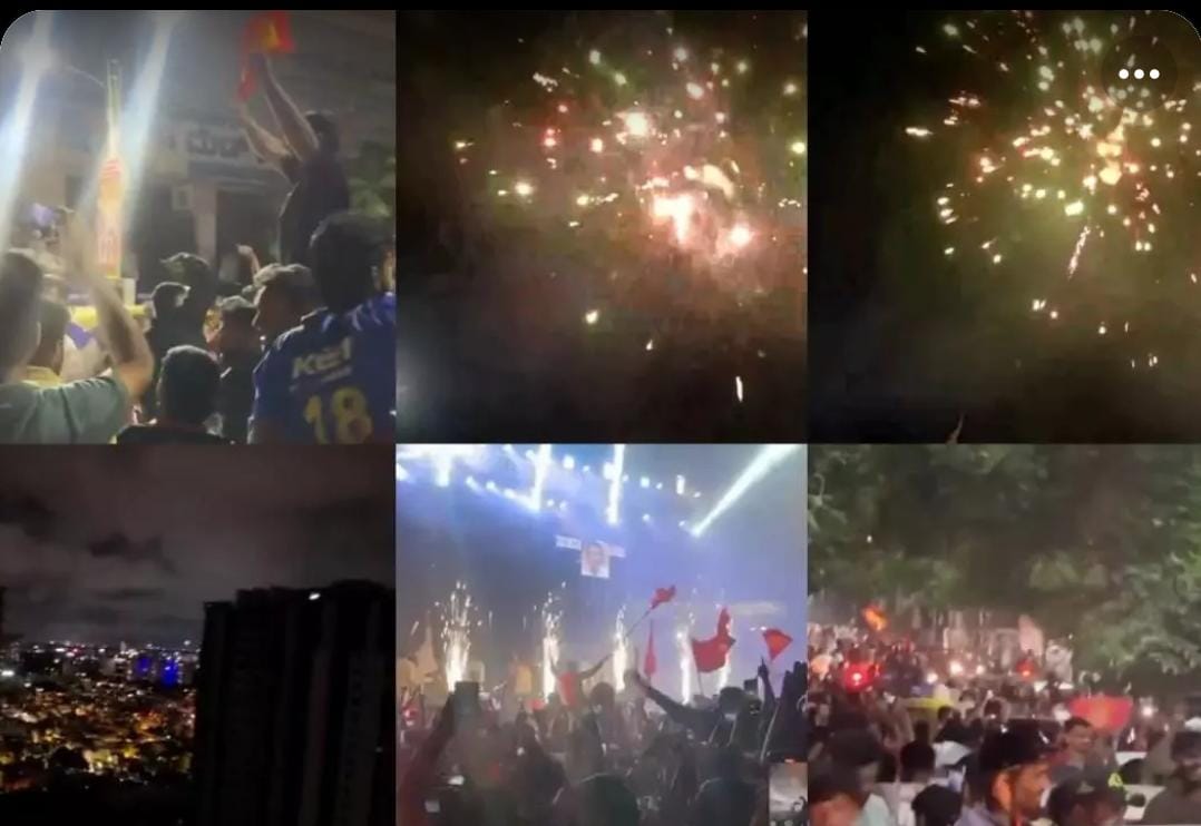 Main News ਰਾਤ ਦਾ ਅਸਮਾਨ ਆਤਿਸ਼ਬਾਜ਼ੀ ਨਾਲ ਚਮਕਿਆ, ਬੈਂਗਲੁਰੂ ਵਿੱਚ ਲੋਕਾਂ ਨੇ... ਟੀਮ ਦੇ ਪਹਿਲੀ ਵਾਰ ਆਈਪੀਐਲ ਜਿੱਤਣ ਤੋਂ ਬਾਅਦ ਜਸ਼ਨ ਮਨਾਉਣ ਲਈ ਵੱਡੀ ਗਿਣਤੀ ਵਿੱਚ RCB ਪ੍ਰਸ਼ੰਸਕ ਰਾਤ ਨੂੰ ਬੇਂਗਲੁਰੂ ਵਿੱਚ... BY Admin DoojaPunjab June 4, 2025 0 Comment
